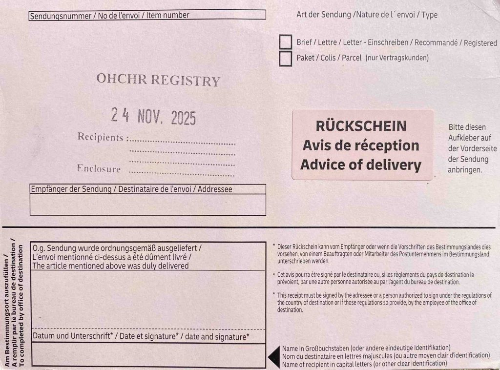 Am 18. November 2025 habe ich per Einschreiben/Rückschein einen Brief mit einer offiziellen Meldung von Vergeltungsmassnahmen (gegen meine Person) an das OHCHR (Office of the High Commissioner for Human Rights) der Vereinten Nationen geschickt.