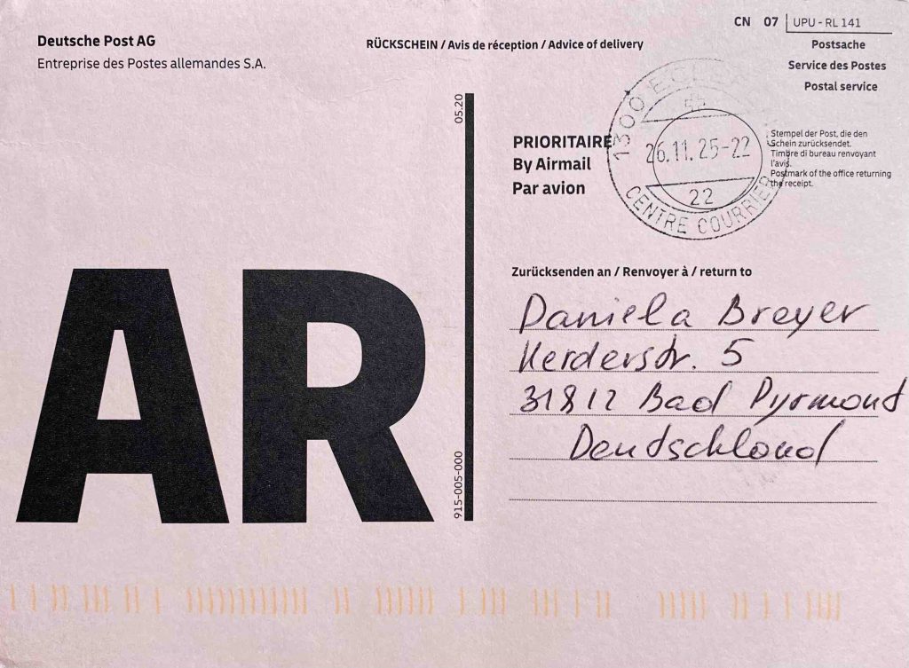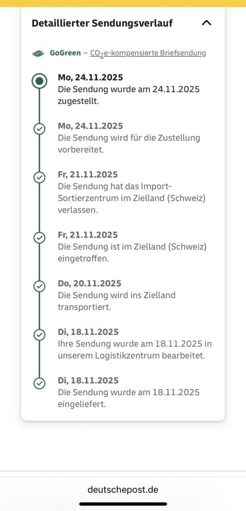 Laut Sendungsverlauf der Deutschen Post wurde die Sendung am 24. November 2025 zugestellt. Dieses Zustelldatum wird auch mit einem Datumsstempel auf dem Rückschein bestätigt.