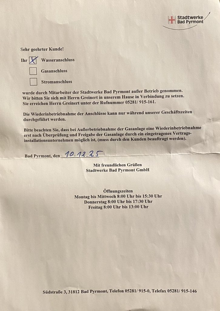 10. Dezember 2025: Erneute Abstellung meiner Wasserversorgung durch die Stadtwerke Bad Pyrmont