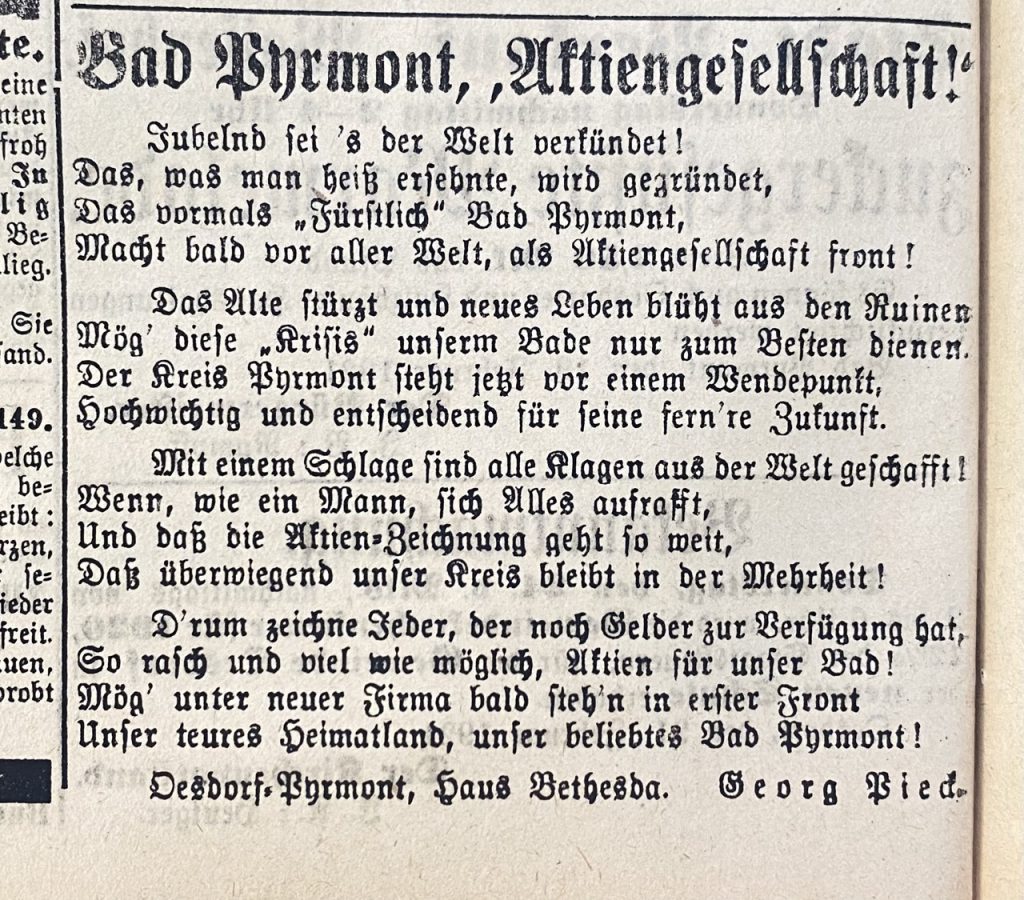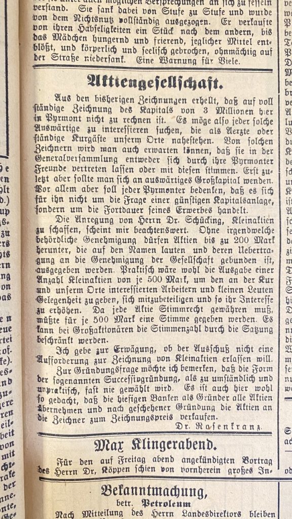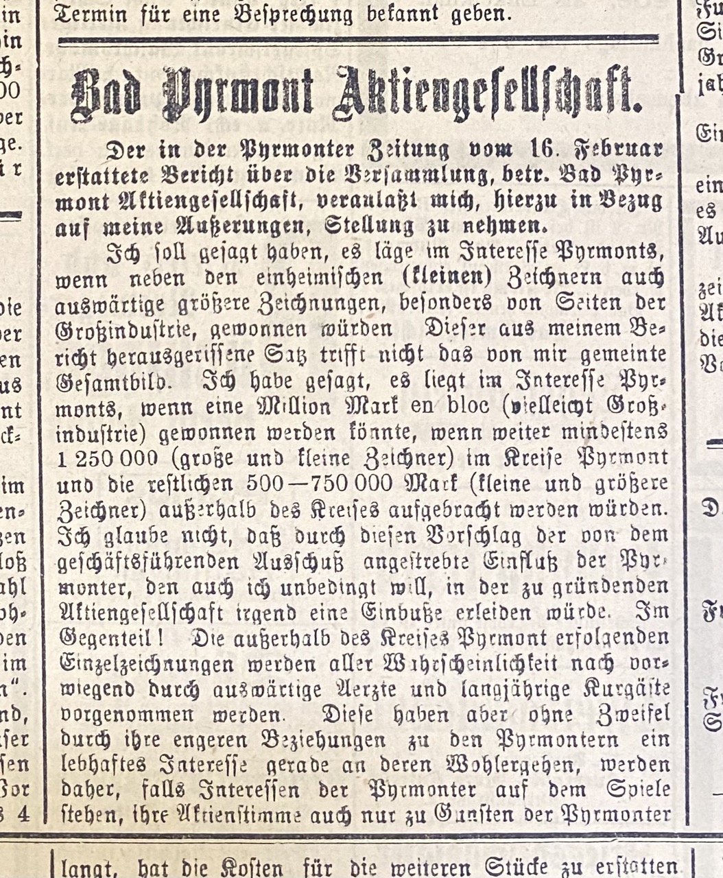 Aus den bisherigen Zeichnungen erhellt, dass auf vollständige Zeichnung des Kapitals von 3 Millionen hier in Pyrmont nicht zu rechnen ist. Es möge also jeder versuchen, solche Auswärtige zu interessieren, die als Ärzte oder ständige Kurgäste unserem Orte nahestehen.