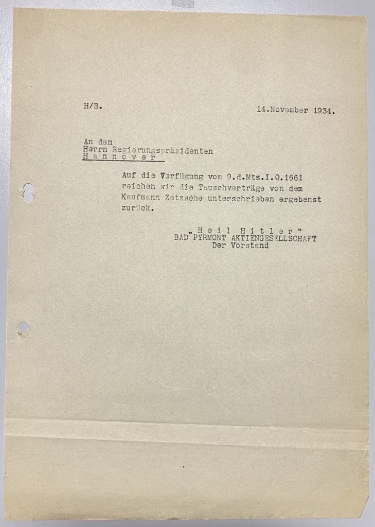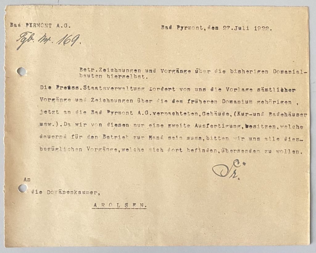 Die Preuss. Staatsverwaltung fordert von uns die Vorlage sämtlicher Vorgänge und Zeichnungen über die dem früheren Domanium gehörigen, jetzt an die Bad Pyrmont A.G. verpachteten, Gebäude, (Kur-und Badehäuser usw.). Da wir von diesen nur eine zweite Ausfertigung besitzen, welche dauernd für den Betrieb zur Hand sein muss, bitten wir uns alle diesbezüglichen Vorgänge, welche sich dort befinden, übersenden zu wollen.“