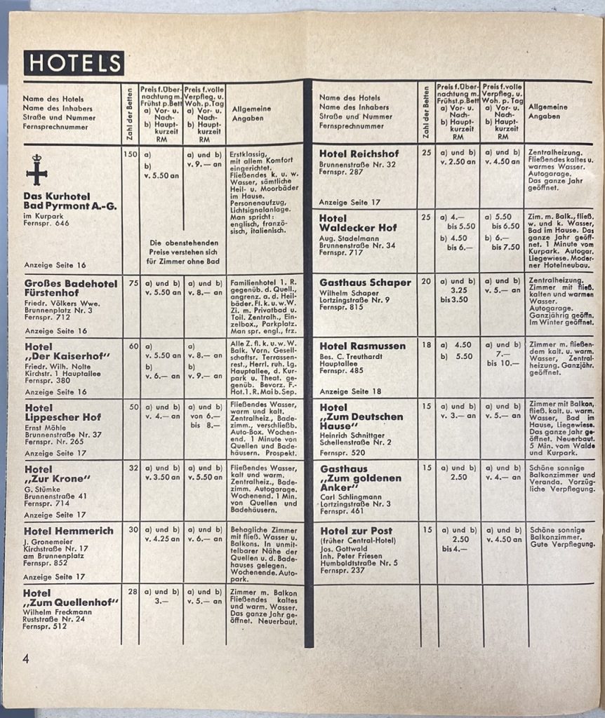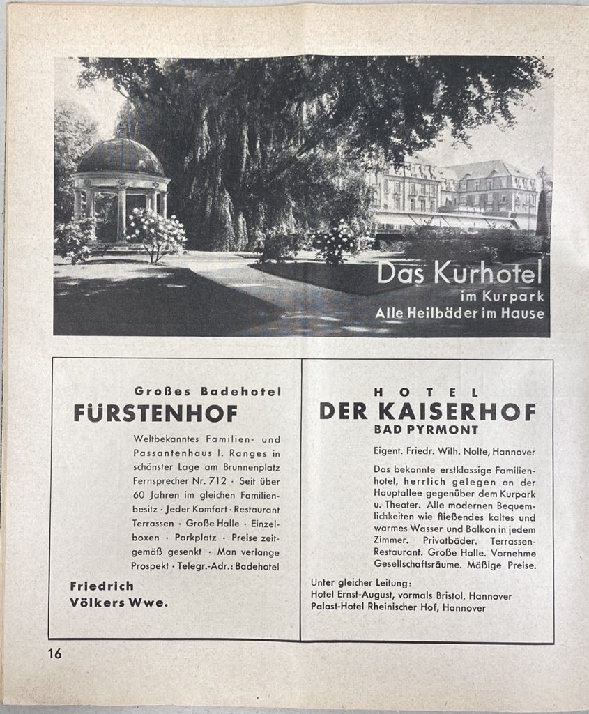 Rubrik Hotels im Wohnungsanzeiger Bad Pyrmont von 1934