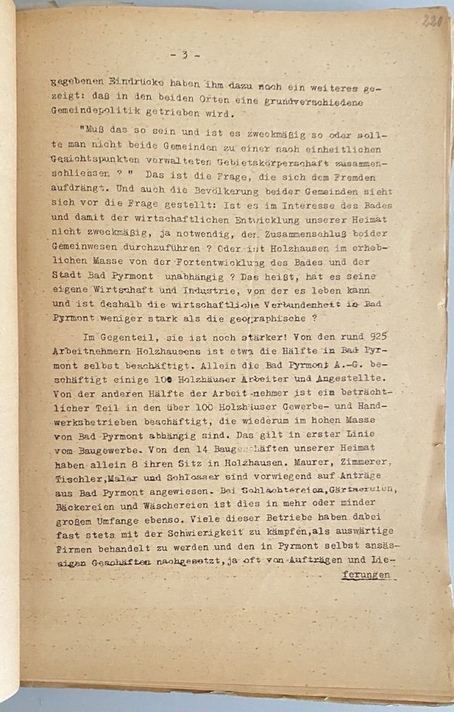 „Von den rund 925 Arbeitnehmern Holzhausens ist etwa die Hälfte in Bad Pyrmont selbst beschäftigt. Allein die Bad Pyrmont A.-G. beschäftigt einige 100 Holzhäuser Arbeiter und Angestellte.