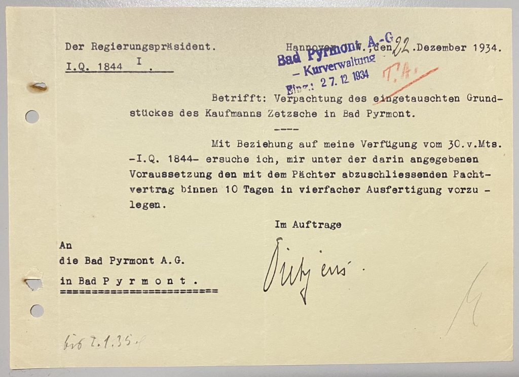 „Betrifft: Verpachtung des eingetauschten Grundstückes des Kaufmanns Zetzsche in Bad Pyrmont.