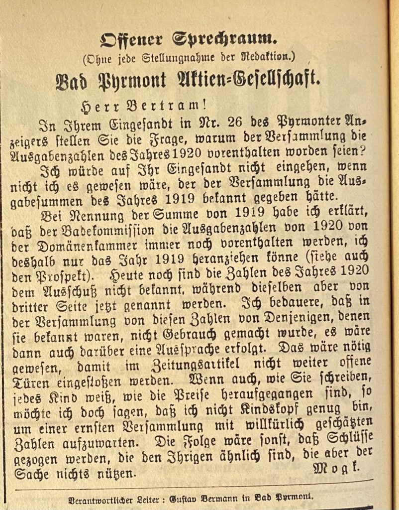 In Ihrem Eingesandt in Nr. 26 des Pyrmonter Anzeigers stellen Sie die Frage, warum der Versammlung die Ausgabenzahlen des Jahres 1920 vorenthalten worden seien?