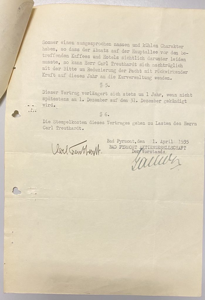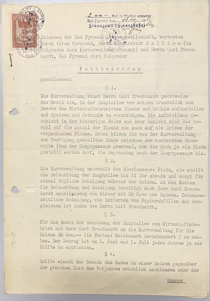 Pachtvertrag zwischen der Bad Pyrmont Aktiongesellschaft, vertreten durch ihren Vorstand, Herrn Kurdirektor Gallion (im folgenden kurz Kurverwaltung genannt) und Herrn Carl Treuthardt, Bad Pyrmont