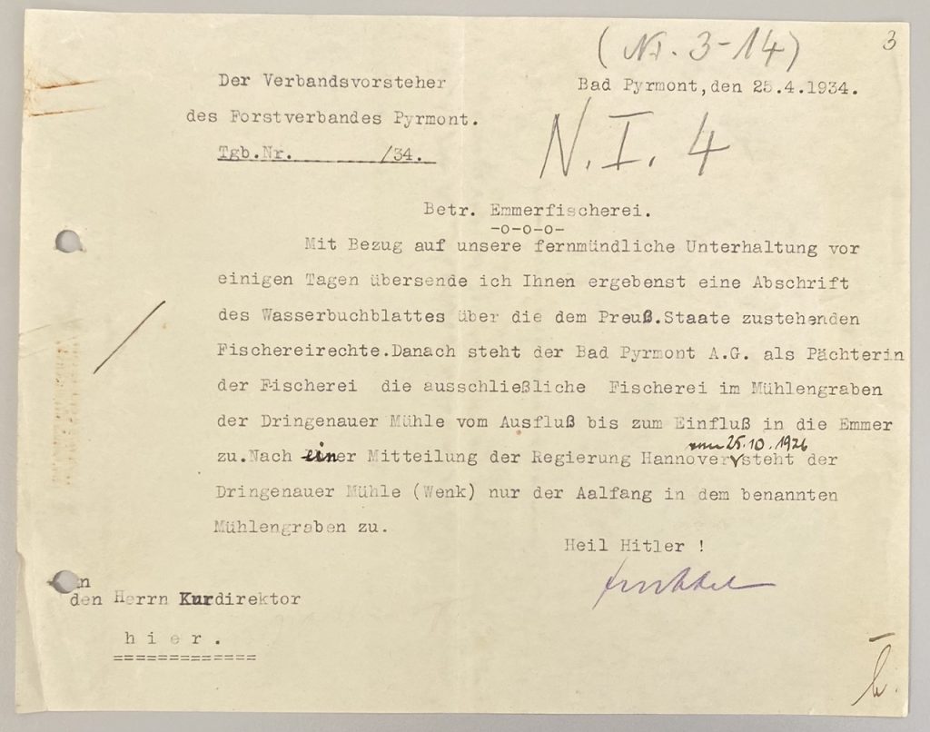 Mit Bezug auf unsere fernmündliche Unterhaltung vor einigen Tagen übersende ich Ihnen ergebenst eine Abschrift des Wasserbuchblattes über die dem Preuß. Staate zustehenden Fischereirechte. Danach steht der Bad Pyrmont A.G. als Pächterin der Fischerei die ausschließliche Fischerei im Mühlengraben der Dringenauer Mühle vom Ausfluß bis zum Einfluß in die Emmer zu.