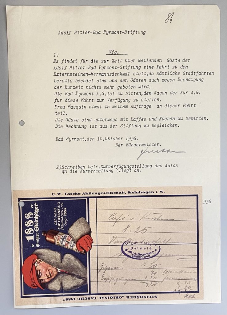„Es findet für die zur Zeit hier weilenden Gäste der Adolf Hitler-Bad Pyrmont-Stiftung eine Fahrt zu den Externsteinen-Hermannsdenkmal statt, da sämtliche Stadtfahrten bereits beendet sind und den Gästen auch wegen Beendigung der Kurzeit nichts mehr geboten wird.