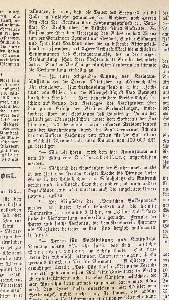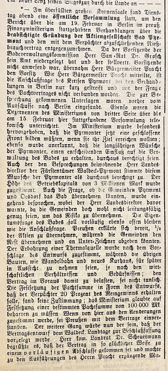 Im überfüllten großen Kronensaal fand Dienstagabend eine öffentliche Versammlung statt, um den Bericht über die am 19. Februar in Berlin im Preußischen Finanzministerium stattgehabten Verhandlungen über die beabsichtigte Gründung der Aktiengesellschaft Bad Pyrmont und den mit dem Verpächter abzuschließenden Nießbrauchvertrag entgegenzunehmen.