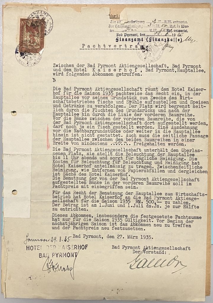 Pachtvertrag zwischen der Bad Pyrmont Aktiengesellschaft, Bad Pyrmont und dem Hotel Kaiserhof, Bad Pyrmont, Hauptallee
