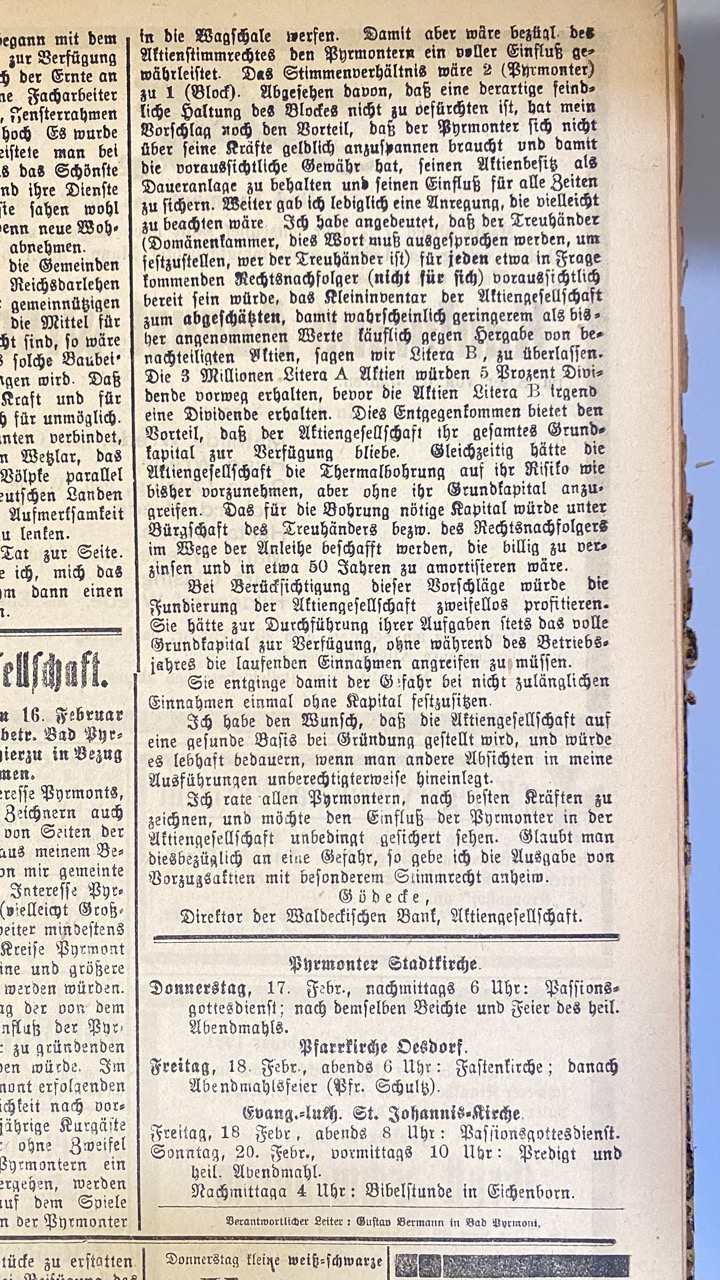 Ich rate allen Pyrmontern, nach besten Kräften zu zeichnen, und möchte den Einfluss der Pyrmonter in der Aktiengesellschaft unbedingt gesichert sehen.