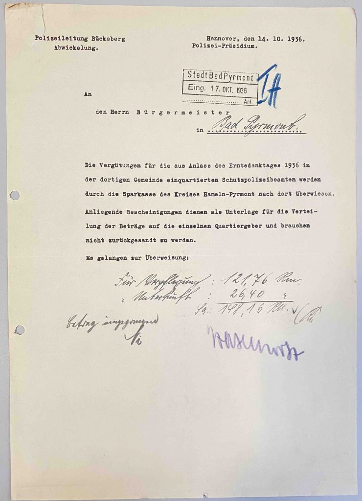 „Die Vergütungen für die aus Anlass des Erntedanktages 1936 in der dortigen Gemeinde einquartierten Schutzpolizeibeamten werden durch die Sparkasse des Kreises Hameln-Pyrmont nach dort überwiesen.