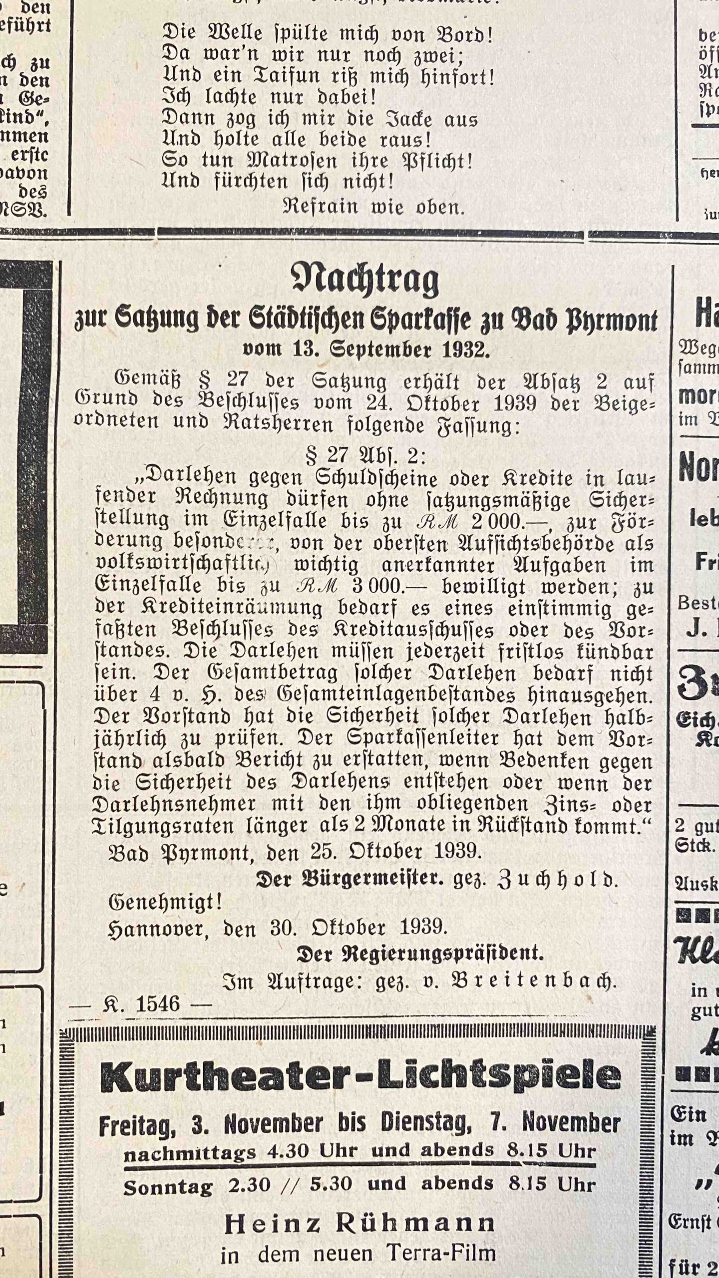 „Nachtrag zur Satzung der Städtischen Sparkasse zu Bad Pyrmont vom 13. September 1932.
