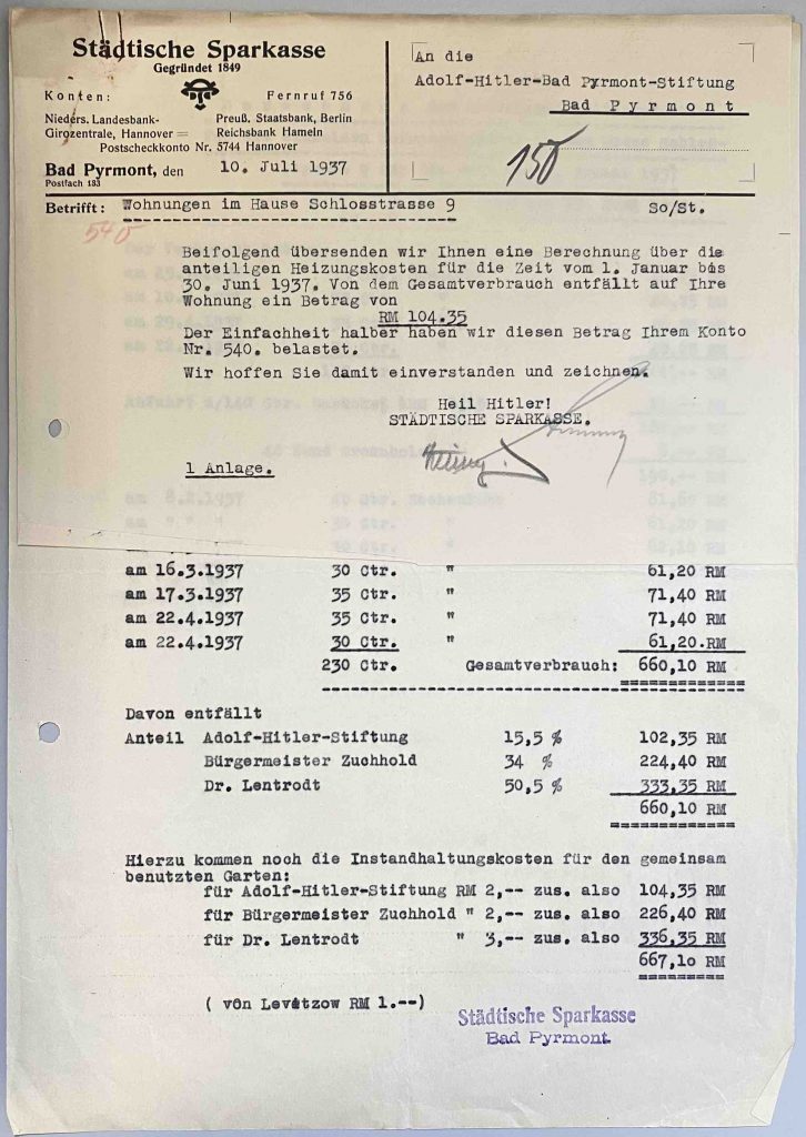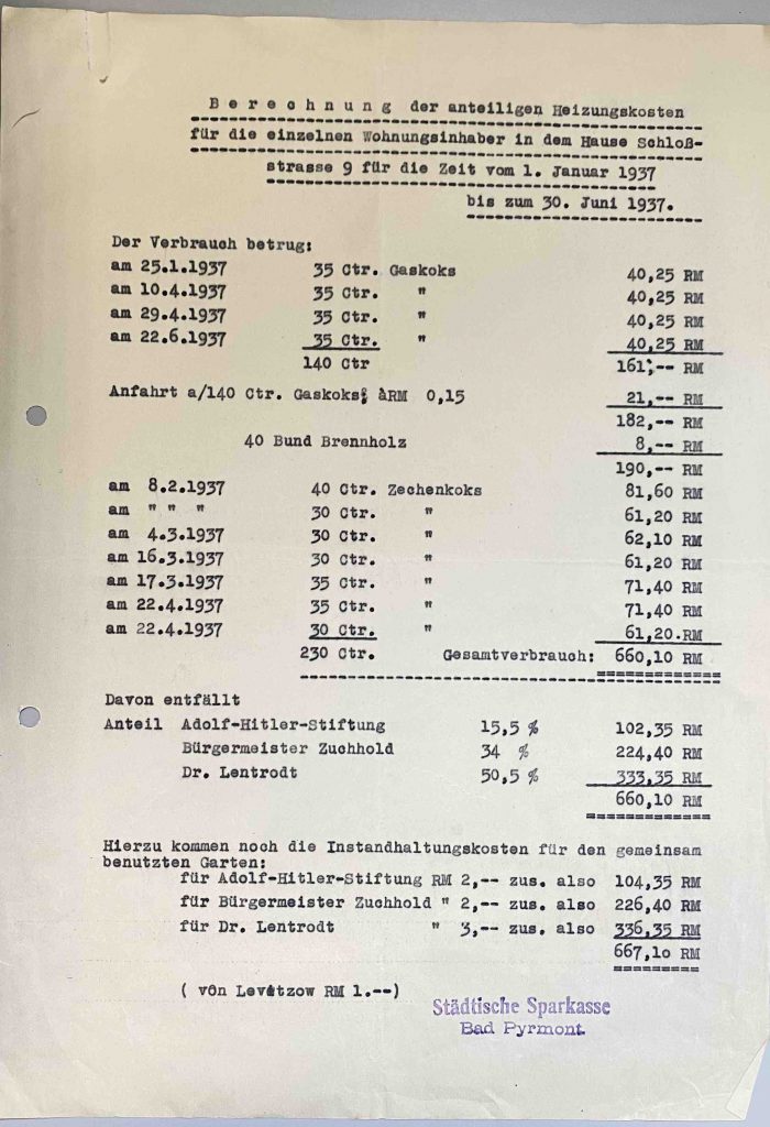 Beifolgend übersenden wir Ihnen eine Berechnung über die anteiligen Heizungskosten für die Zeit vom 1. Januar bis 30. Juni 1937. Von dem Gesamtverbrauch entfällt auf Ihre Wohnung ein Betrag von RM 104.35. Der Einfachheit halber haben wir diesen Betrag Ihrem Konto Nr. 540 belastet.