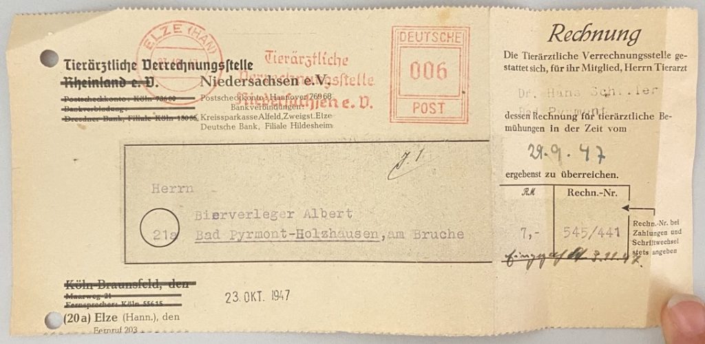 Rechnung von der Tierärztlichen Verrechnungsstelle Niedersachsen e. V. für ihr Mitglied Herrn Tierarzt Dr. Hans Schiffer (Bad Pyrmont)