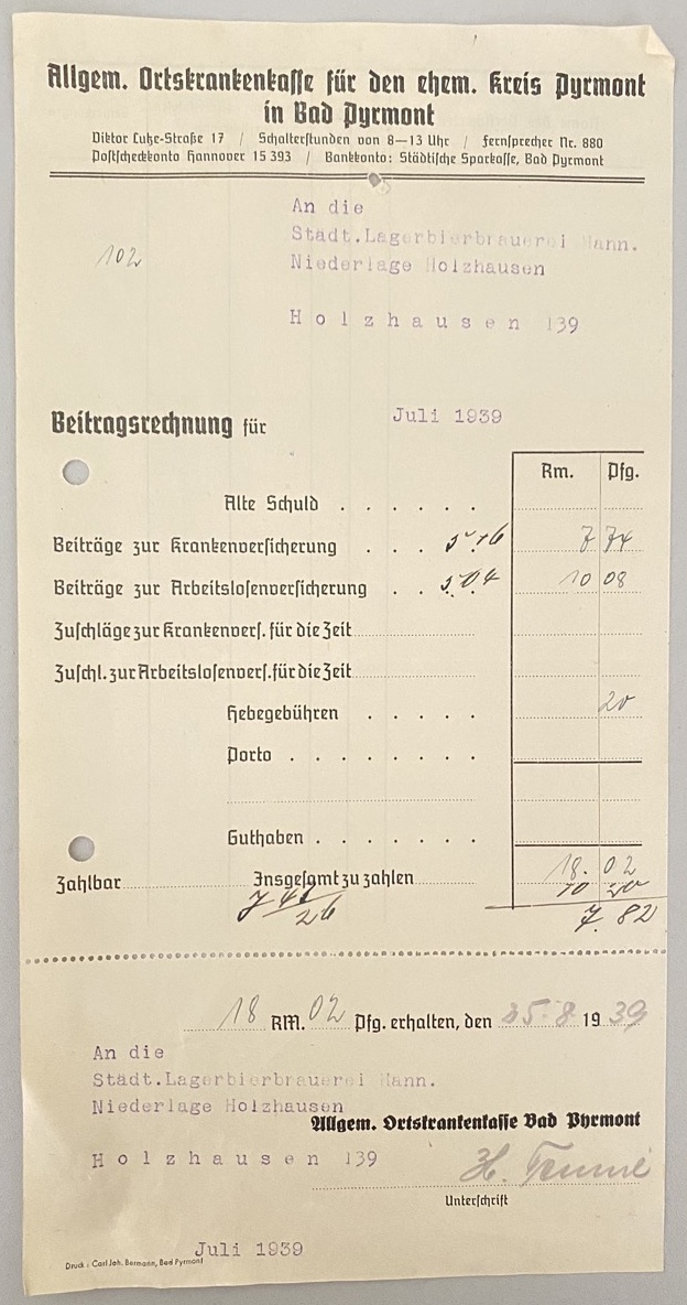 Beitragsrechnung der Allgemeinen Ortskrankenkasse für den ehemaligen Kreis Pyrmont in Bad Pyrmont