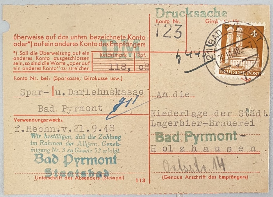 Drucksache für Rechnung vom 21.09.1948 vom Staatsbad Bad Pyrmont