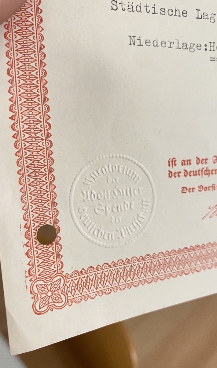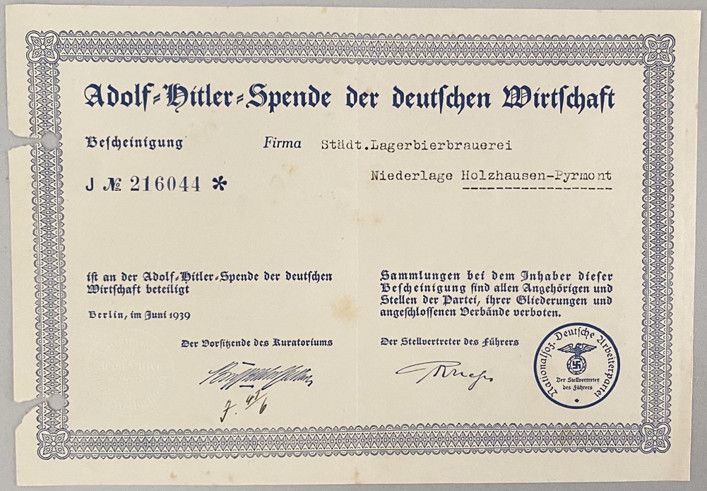 „(Die) Firma Städt. Lagerbierbrauerei Niederlage Holzhausen-Pyrmont ist an der Adolf-Hitler-Spende der deutschen Wirtschaft beteiligt.